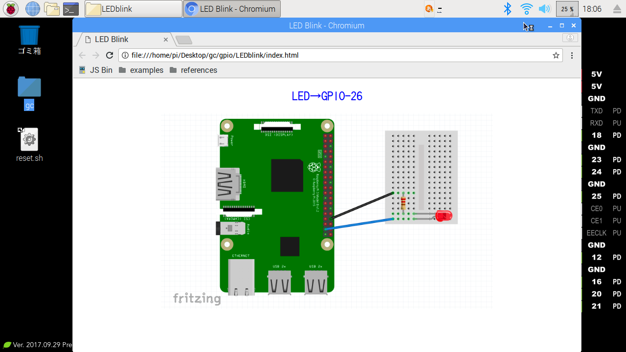 サンプルコードを実行する前に、必ず先ほど開いた file:///home/pi/Desktop/gc/gpio/LEDblink/index.html