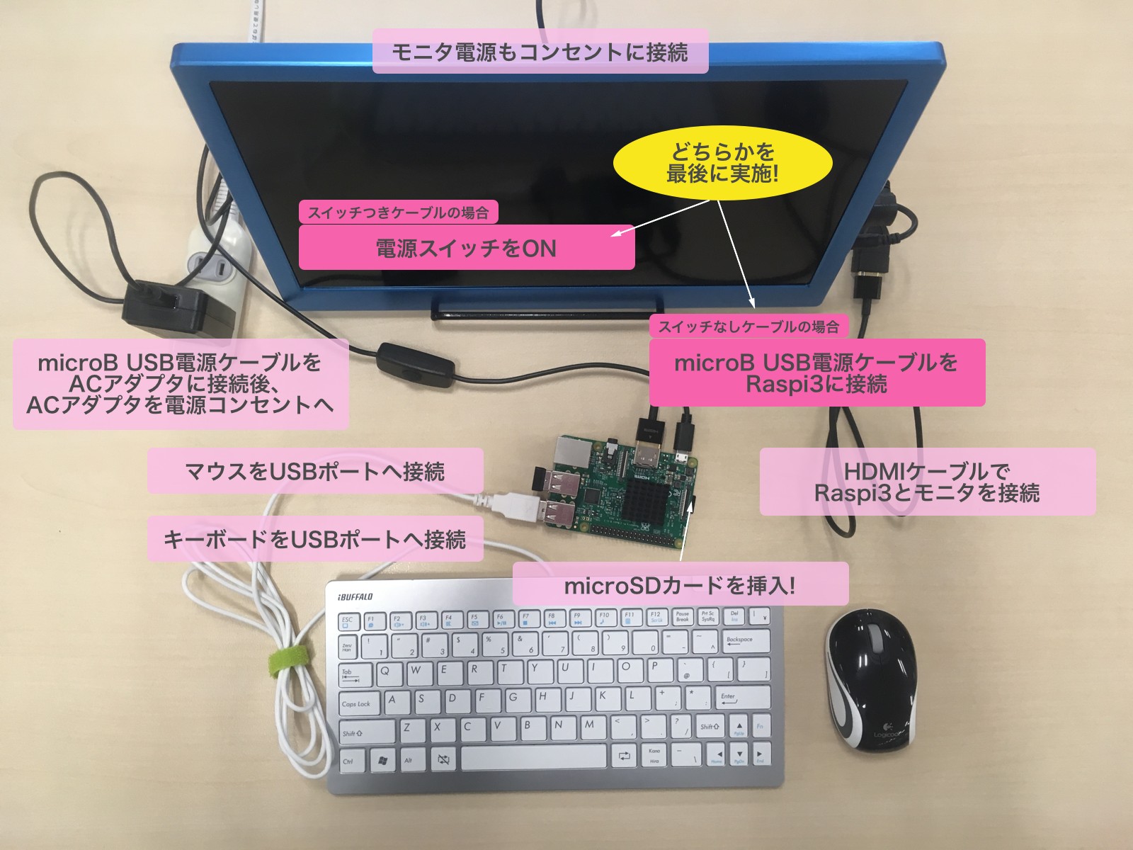 - Raspi 4 では電源ケーブルが USB Type C ケーブルとなりますが、基本的な接続方法は以下と同様です