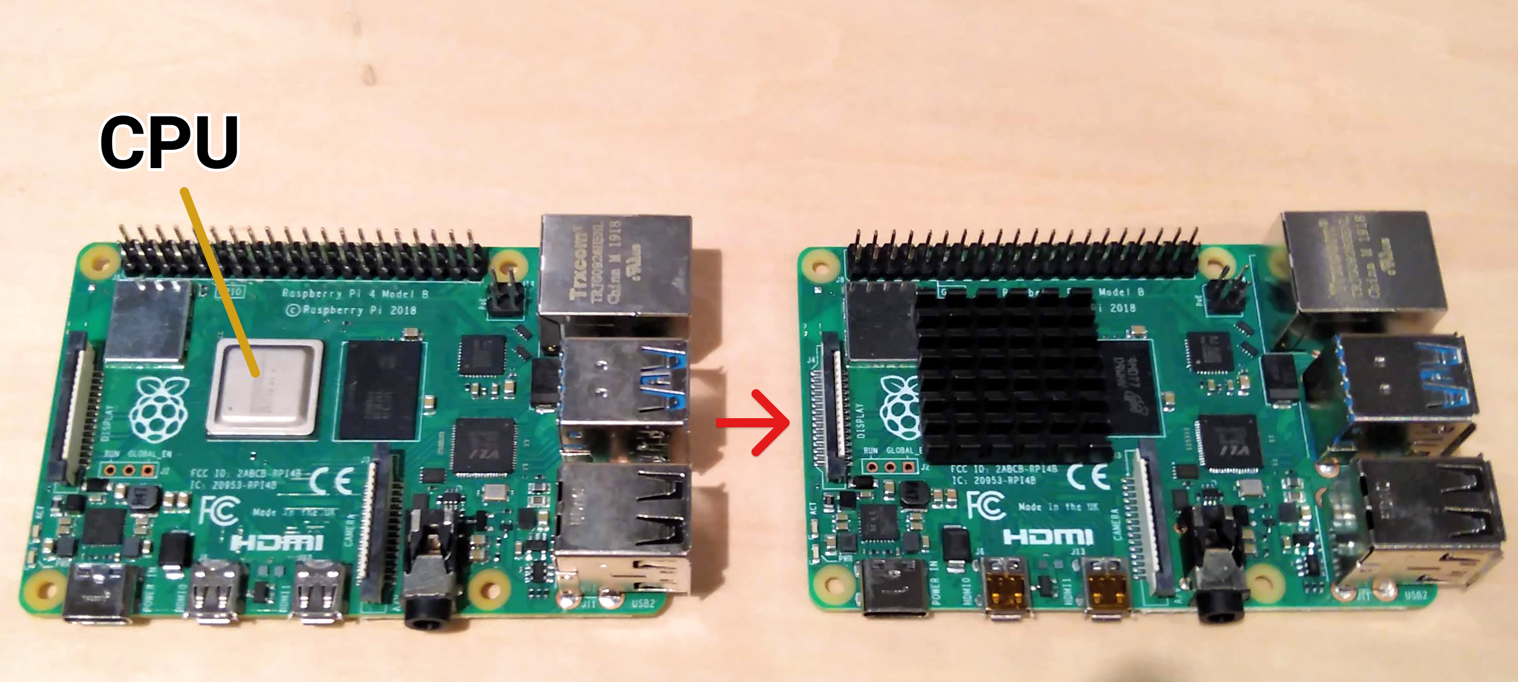Raspberry Pi (特に Raspi 4) の CPU は非常に高温になるため冷却しなければなりません (冷却不足では高負荷時に CPU 速度が大幅に低下します)。 あらかじめ CPU には熱伝達シールでヒートシンクを取り付けておきましょう。