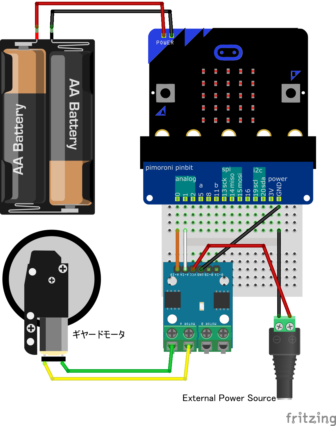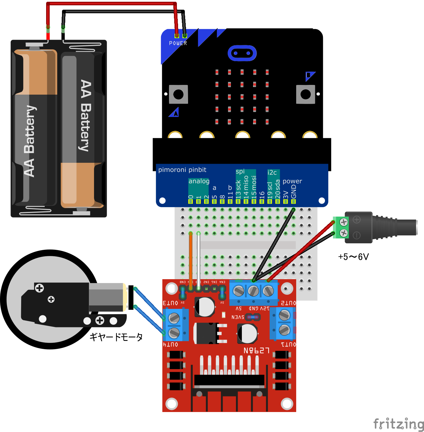 USB 変換程度の外部電源ではモーター側に供給する電力が不足することがあります。特に L298N はそれ自体も電力消費するため注意が必要です